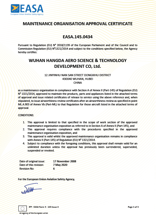 2020年5月 徑河廠(chǎng)區(qū)獲得EASA維修許可。